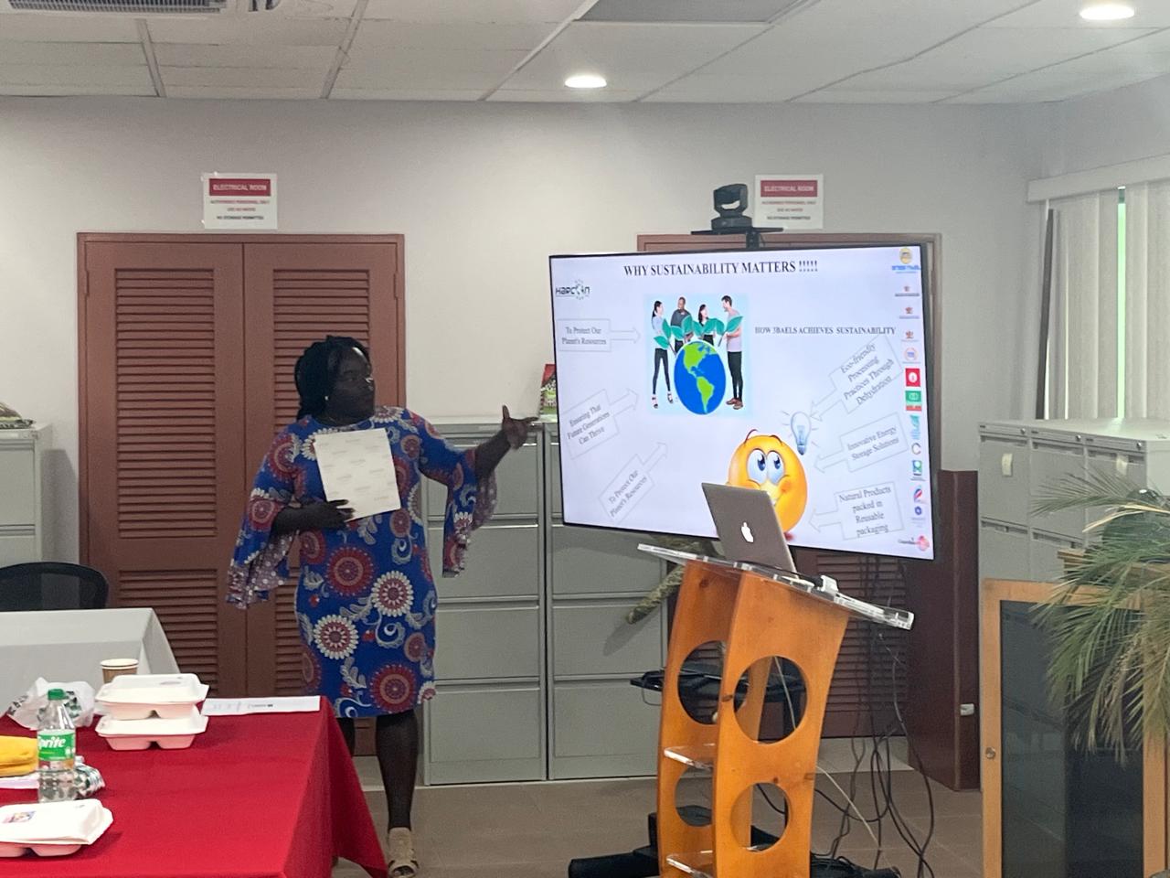 Another highlight was the guest facilitator, Ms. Mahalia Joseph, a proud employee of HARCON and young female entrepreneur. During an official sabbatical from her duties at HARCON, she has pioneered the development of two sustainable offerings—Allamanda Flavours (look out for it at a supermarket near you), which provides natural, locally sourced dried herbs and spices through eco-friendly practices that support local farmers, promote healthy eating, and reduce food waste; and ECOBATT, an innovative invention that stores solar energy in sand, potentially outperforming lithium batteries in terms of energy output while minimizing environmental impact.